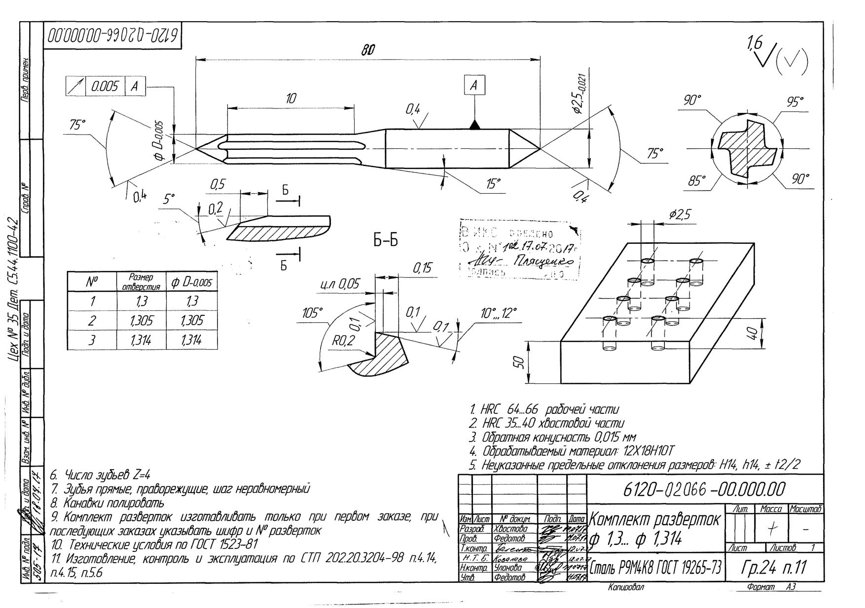 Развертка 10Н7(D=10Н7, d=9,95 мм., d1=10 мм., L=198 мм., l=70 + (5мм), l1=40 мм., l2=70 + (5мм).¶)